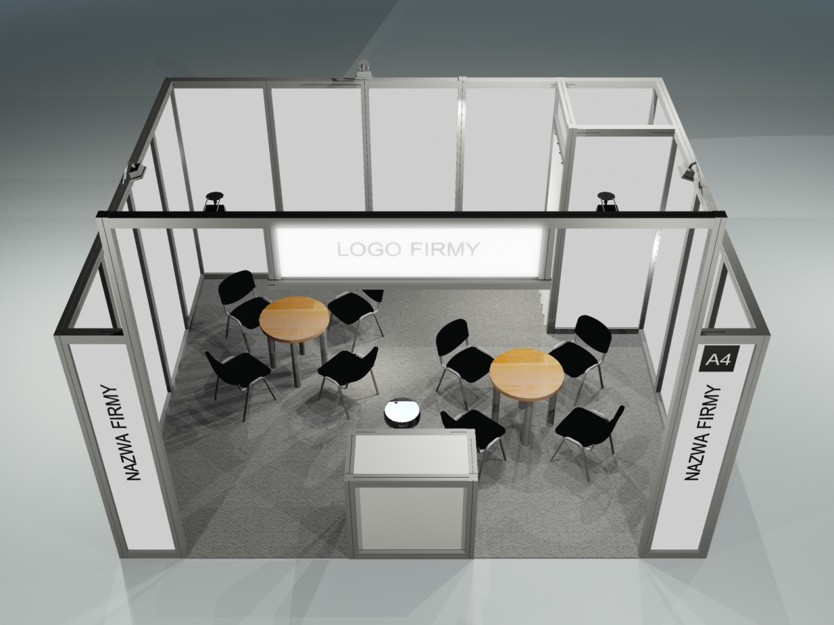 The prices cover the rent of space in the exhibition hall together with a booth construction and basic furniture. The minimal space in this area is 9 sqm. The exhibitors are allocated the space upon first come, first served basis. Shell scheme includes (visualization above):