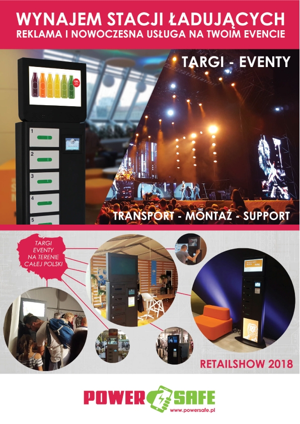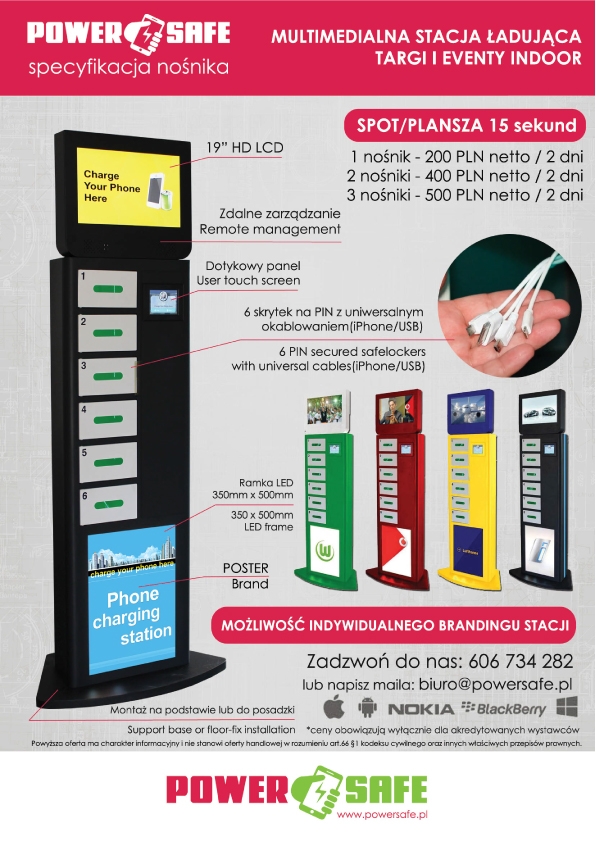 Ładowarki PowerSafe mają formę estetycznych i bezpiecznych stacji z sejfami do ładowania, w których można bezpłatnie naładować telefon komórkowy, zachowując jednocześnie funkcjonalność multimedialnych pylonów reklamowych z wyświetlaczem LCD, systemem audio oraz podświetlanym displayem formatu 350x500mm. Ze względu na formę i funkcję użytkową, stacje PowerSafe są obecnie jedną z najskuteczniejszych form reklamy indoor.